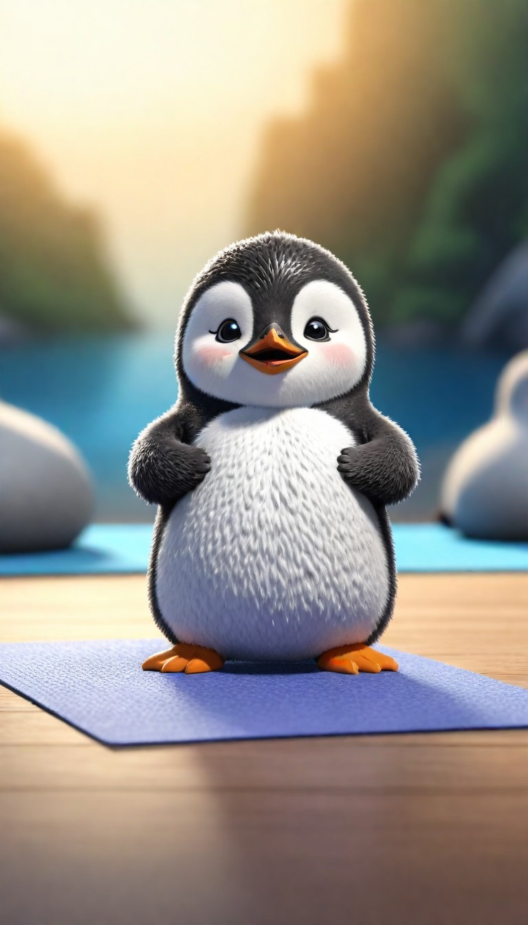 A cartoon penguin smiles while standing on a blue yoga mat, with other penguins in the background.