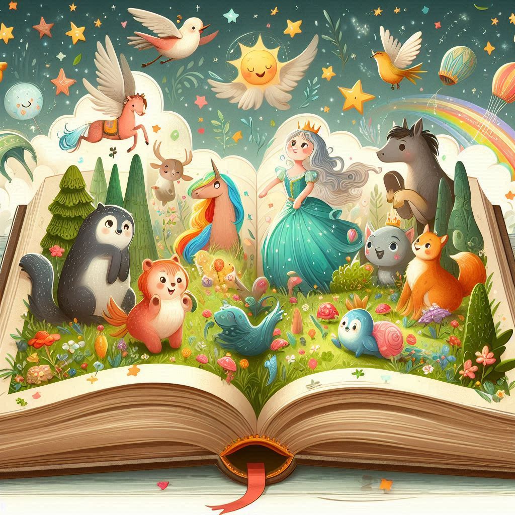 A princess stands in a magical forest that is depicted as an open book, surrounded by various animals and mythical creatures.