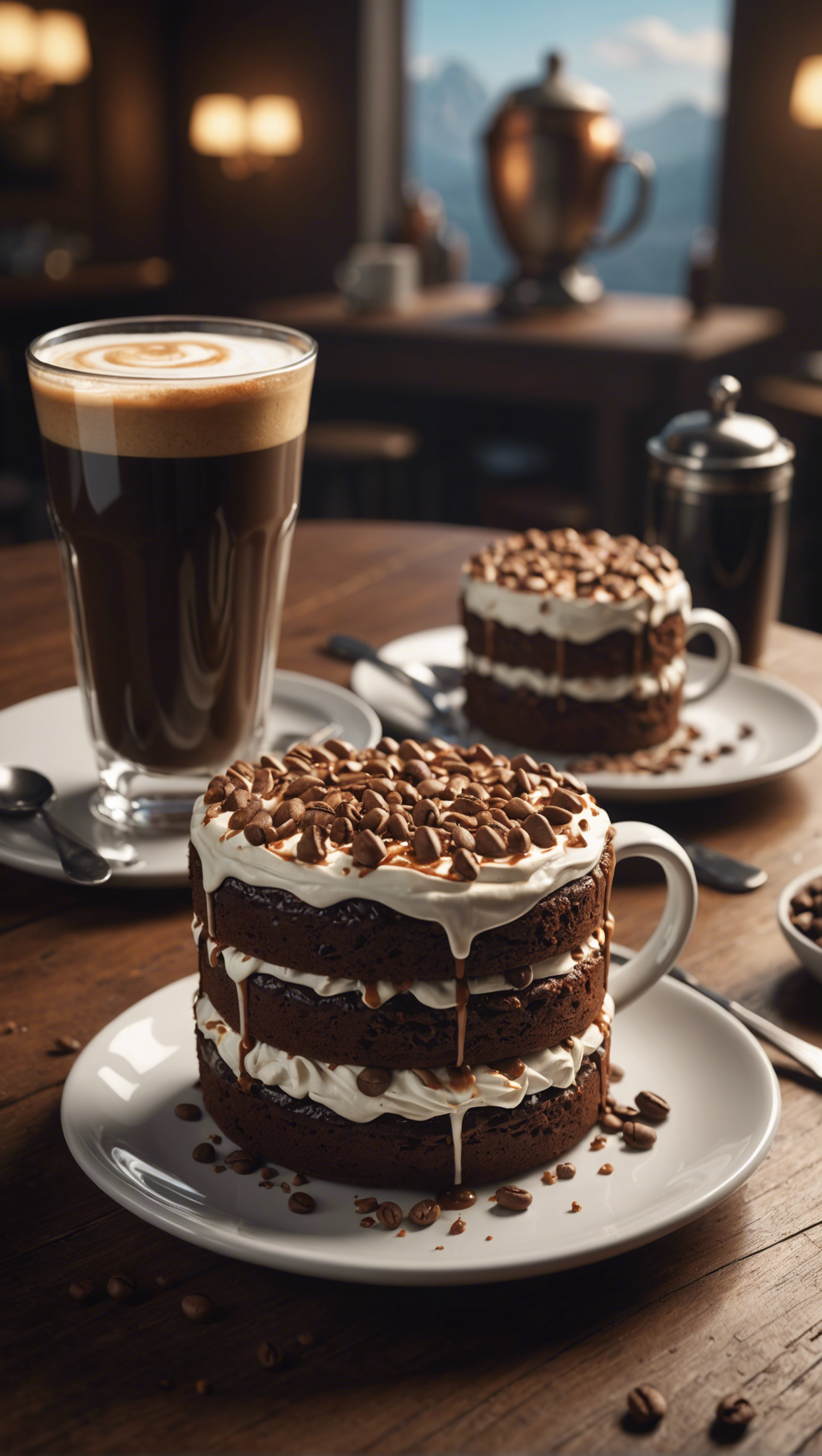 bakery, beans, cafe, cake, chips, chocolate, coffee, delicious, dessert, drink, foam, frosting, glass, latte, plate, sweet, table, tasty, white, wooden