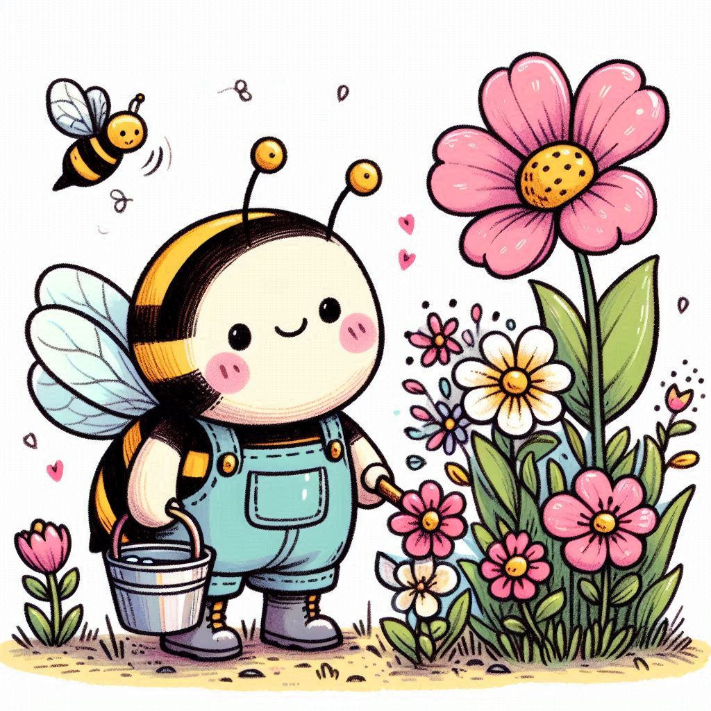 A cartoon bee wearing overalls and holding a watering can waters flowers in a garden.