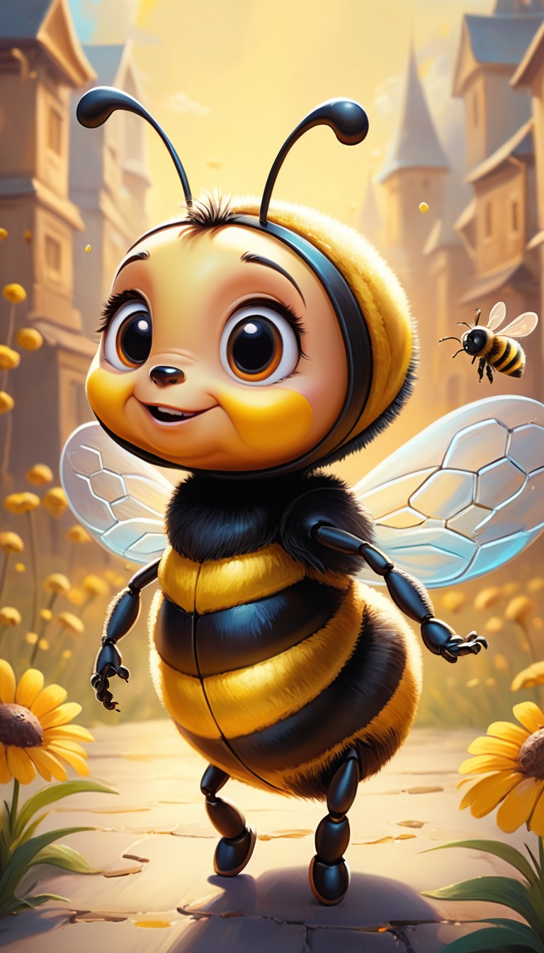 A cartoon bee walks along a cobblestone pathway, past buildings in a city, with a smaller bee flying in the background.