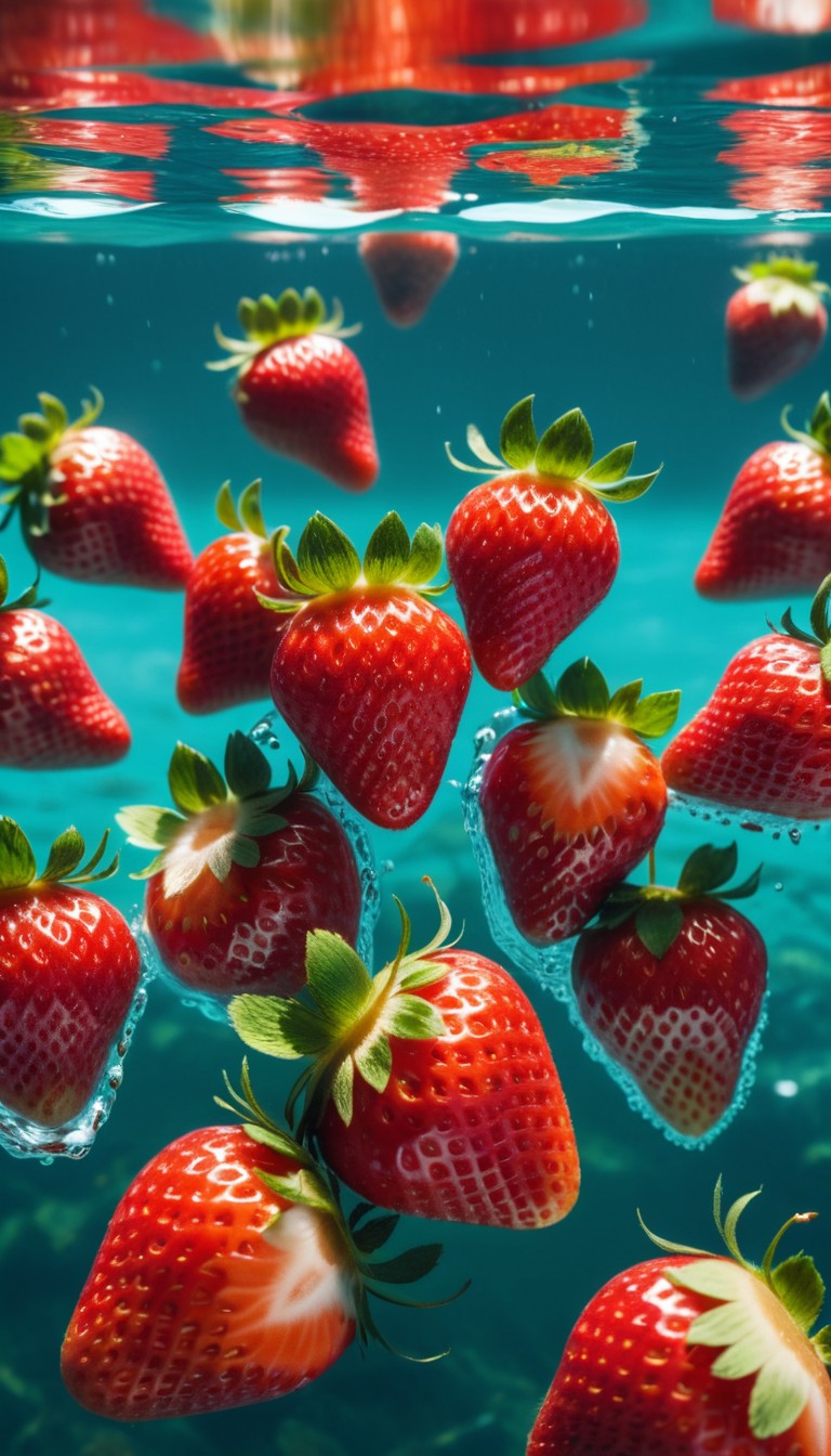 Strawberries sink and float in a turquoise pool of water, creating a vibrant, summery scene.