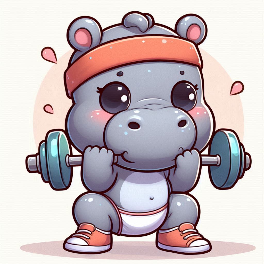 A cartoon hippopotamus wearing a headband and sneakers is lifting weights while squatting.