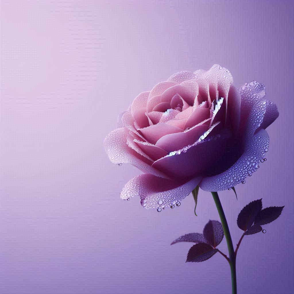 A single purple rose with dew drops on its petals stands out against a soft purple background.