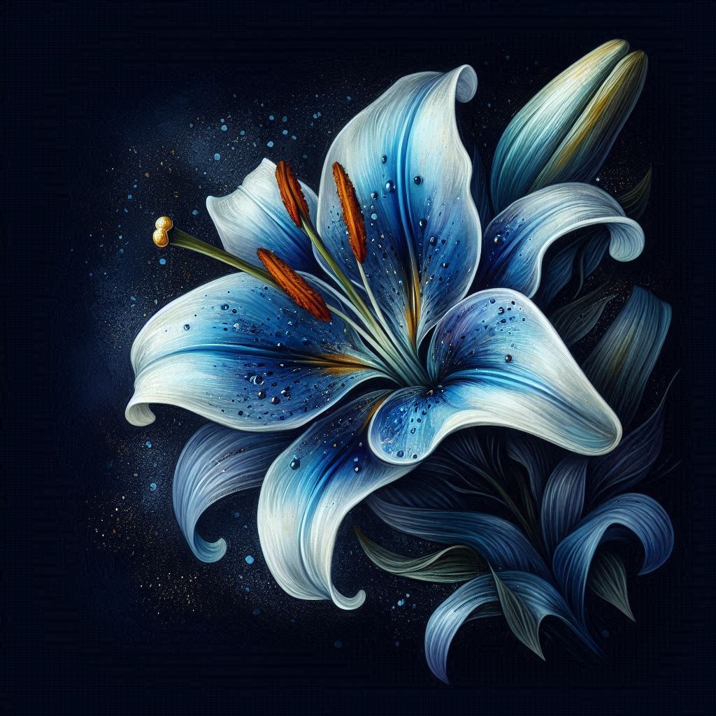 art, background, blue, botanical, closeup, dark, detail, digital, droplets, flower, illustration, leaves, lily, macro, nature, orange, petals, stem, water, white