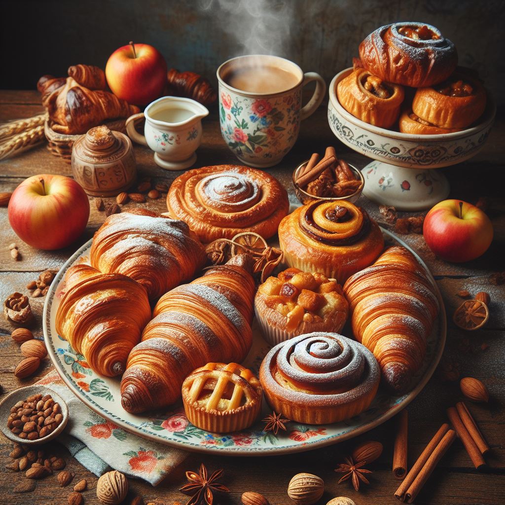 A variety of pastries, including croissants and cinnamon rolls, are arranged on a plate with a cup of steaming coffee and apples.