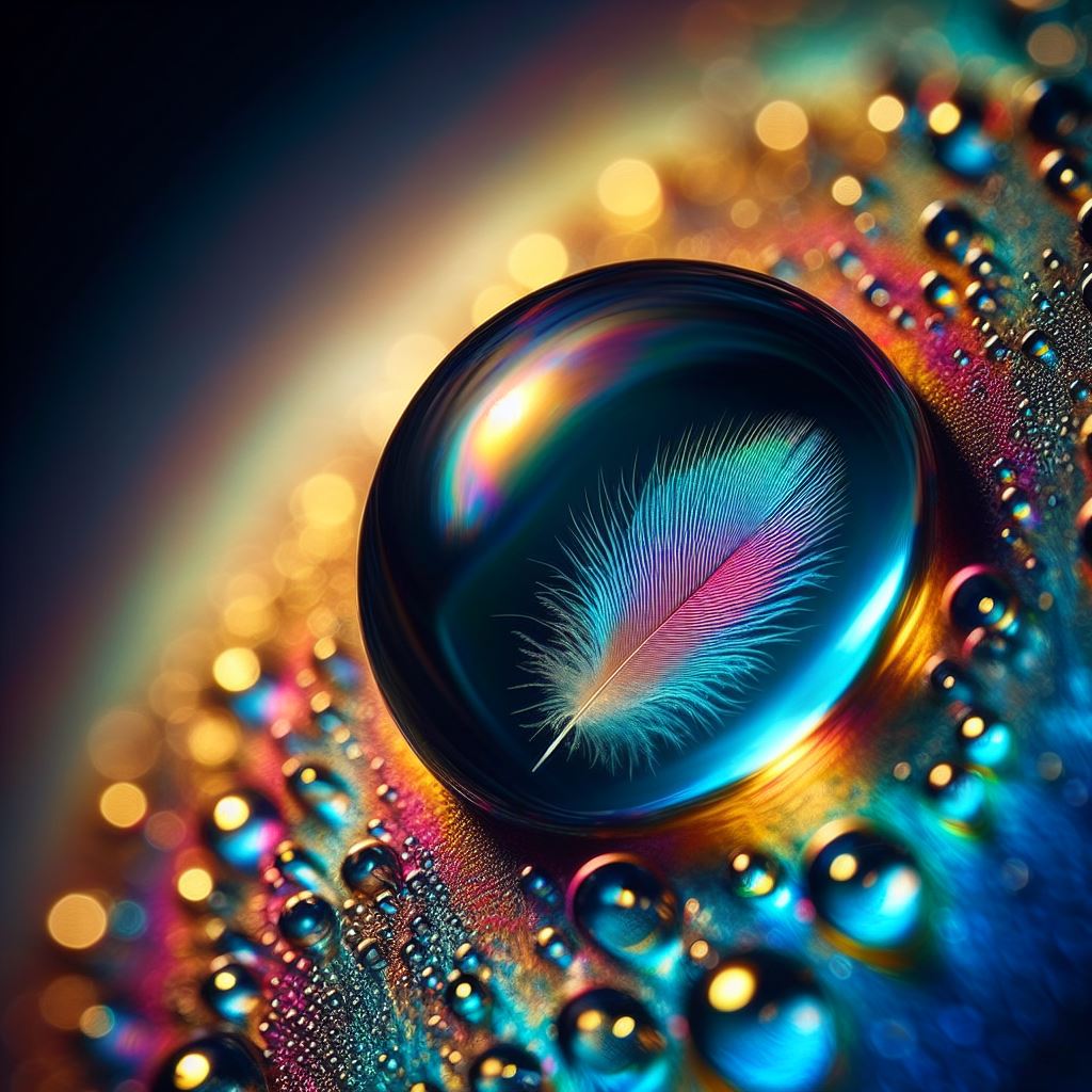 An iridescent water droplet holds a delicate feather, surrounded by colorful smaller drops