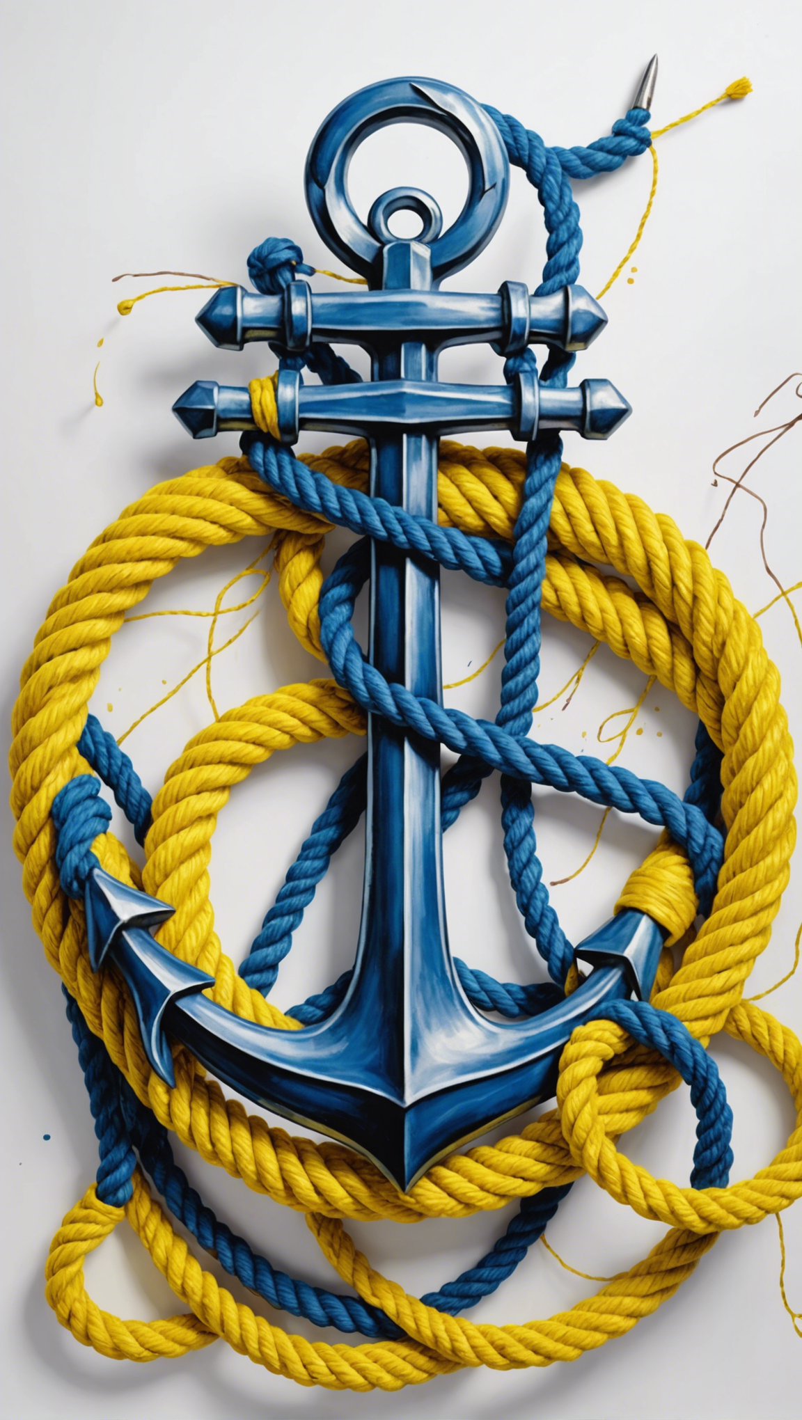 A close-up view of a blue anchor intertwined with yellow and blue ropes.