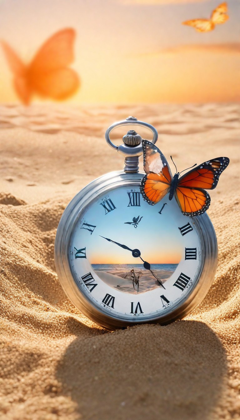 A pocket watch with a sunset beach scene reflected in its face rests in the sand, a butterfly perched on its edge.