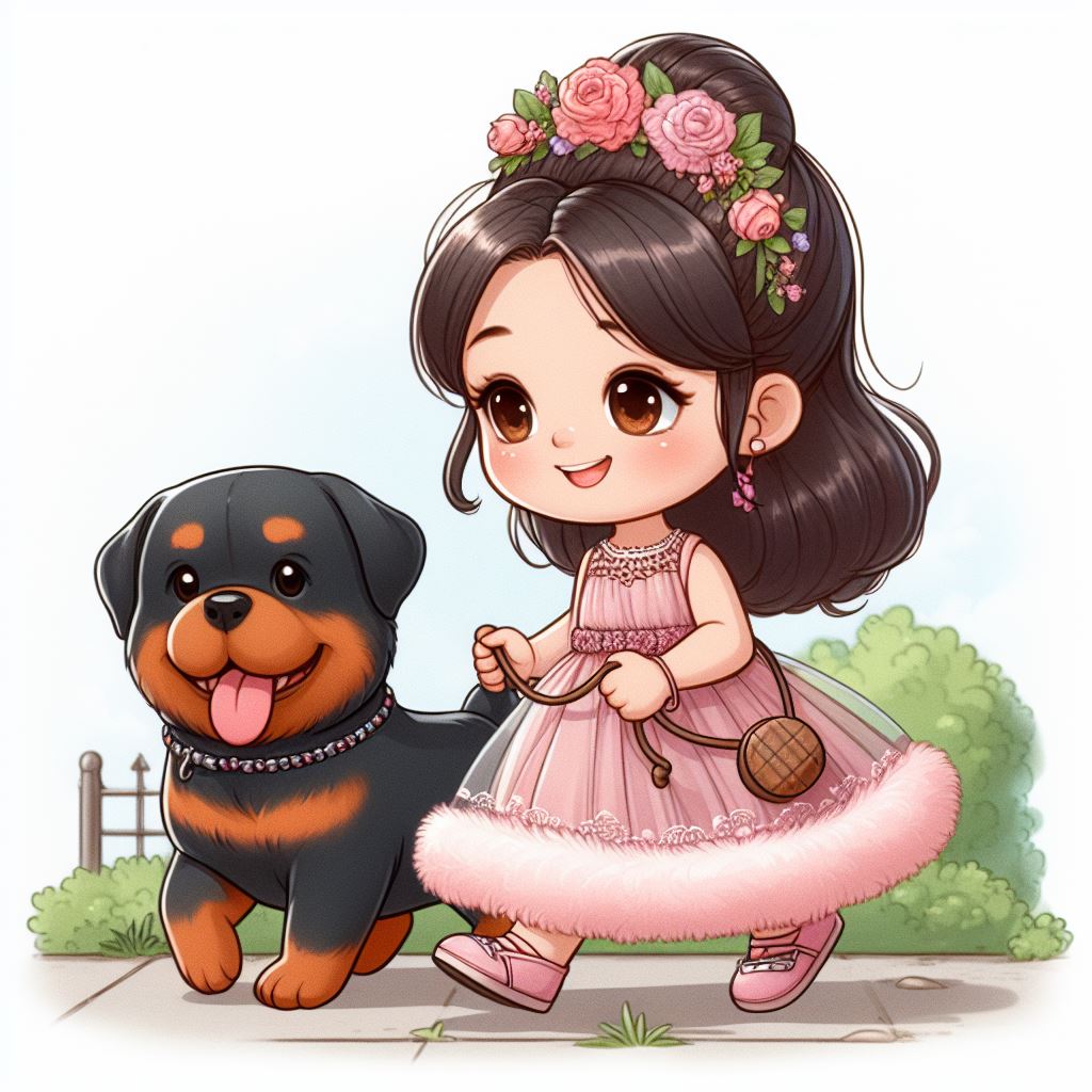 adorable, canine, cartoon, character, crown, cute, dog, dress, flower, girl, happy, illustration, leash, owner, pet, pink, puppy, rottweiler, sidewalk, walking