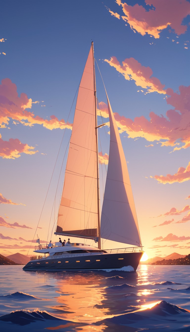 A sailboat with white sails glides across calm water with a golden sunset reflected on the surface.