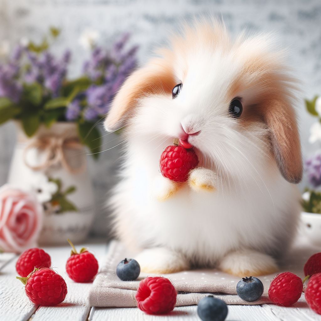 A white and brown bunny sits on a table and eats a raspberry. There are other berries scattered around it.