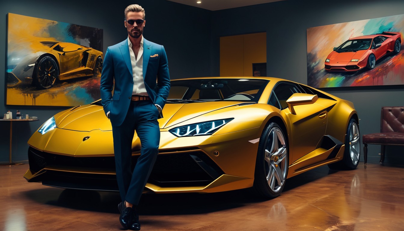 automotive, car, dream, expensive, garage, gold, italian, lamborghini, leaning, lifestyle, luxury, man, modern, sports, standing, suit, supercar, vehicle, wealthy, yellow
