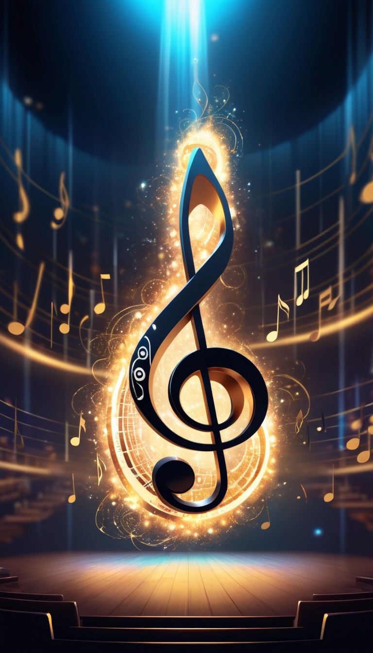 A large G clef glows on a concert stage, surrounded by musical notes.