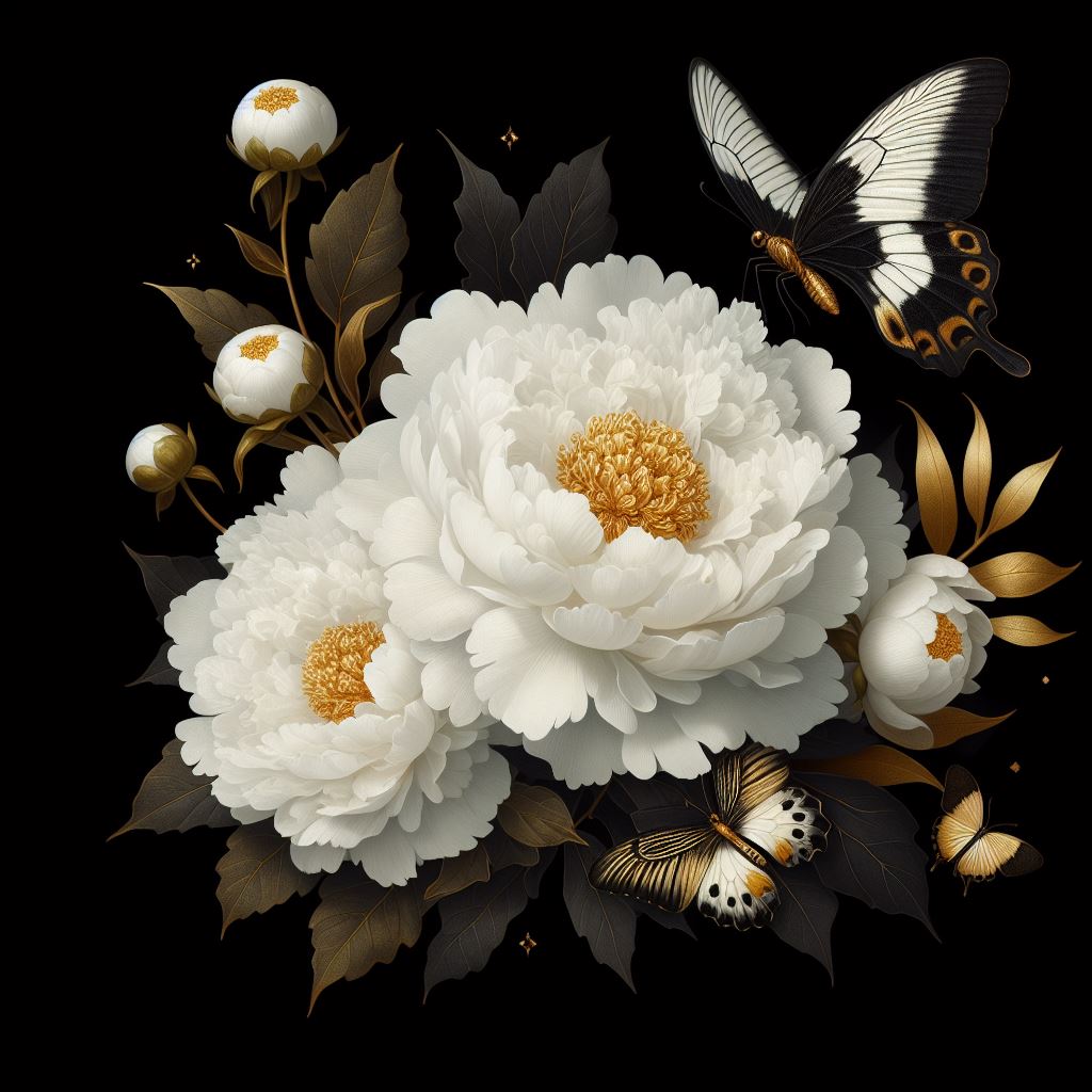 White peonies and butterflies on a black background. Gold accents and greenery decorate the image.