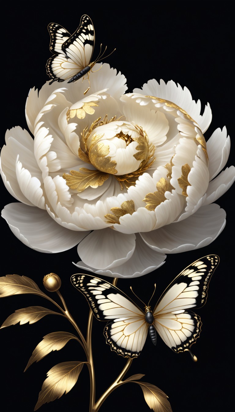 art, beauty, black, blooming, blossom, butterfly, delicate, elegance, floral, flower, gold, golden, insect, macro, nature, peony, petals, spring, white, wings