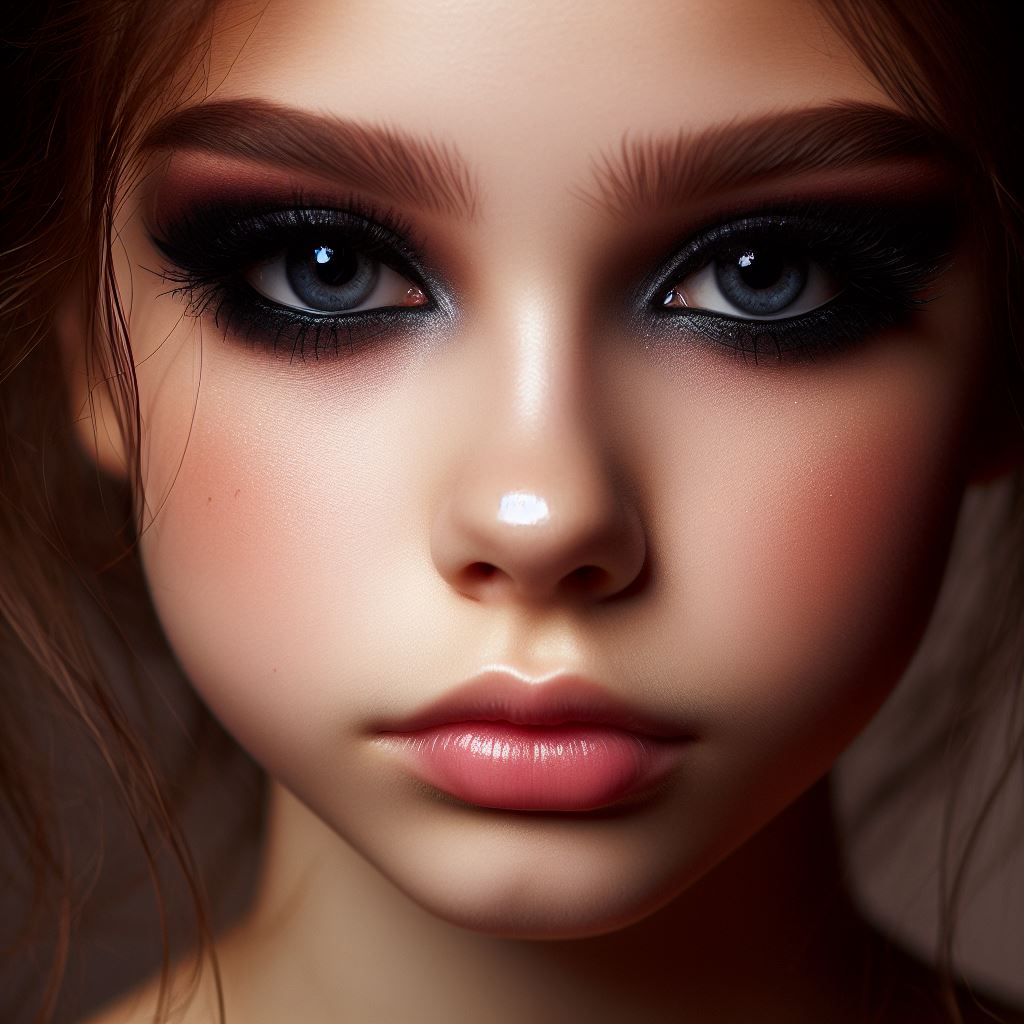 A close-up portrait of a woman with dark eyeshadow and eyeliner, highlighting her blue eyes and delicate features.