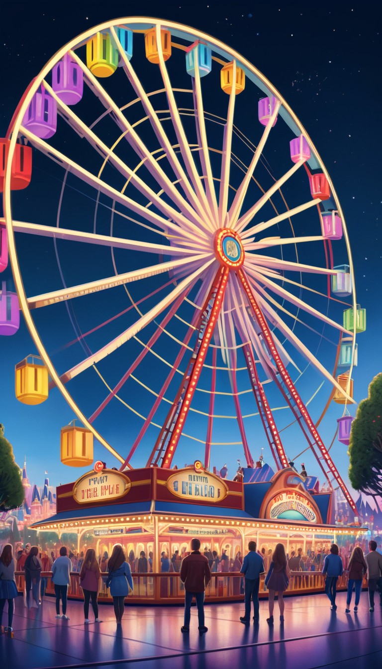 A large ferris wheel stands tall against a night sky, illuminated with colorful lights. People gather below, enjoying the park's attractions.
