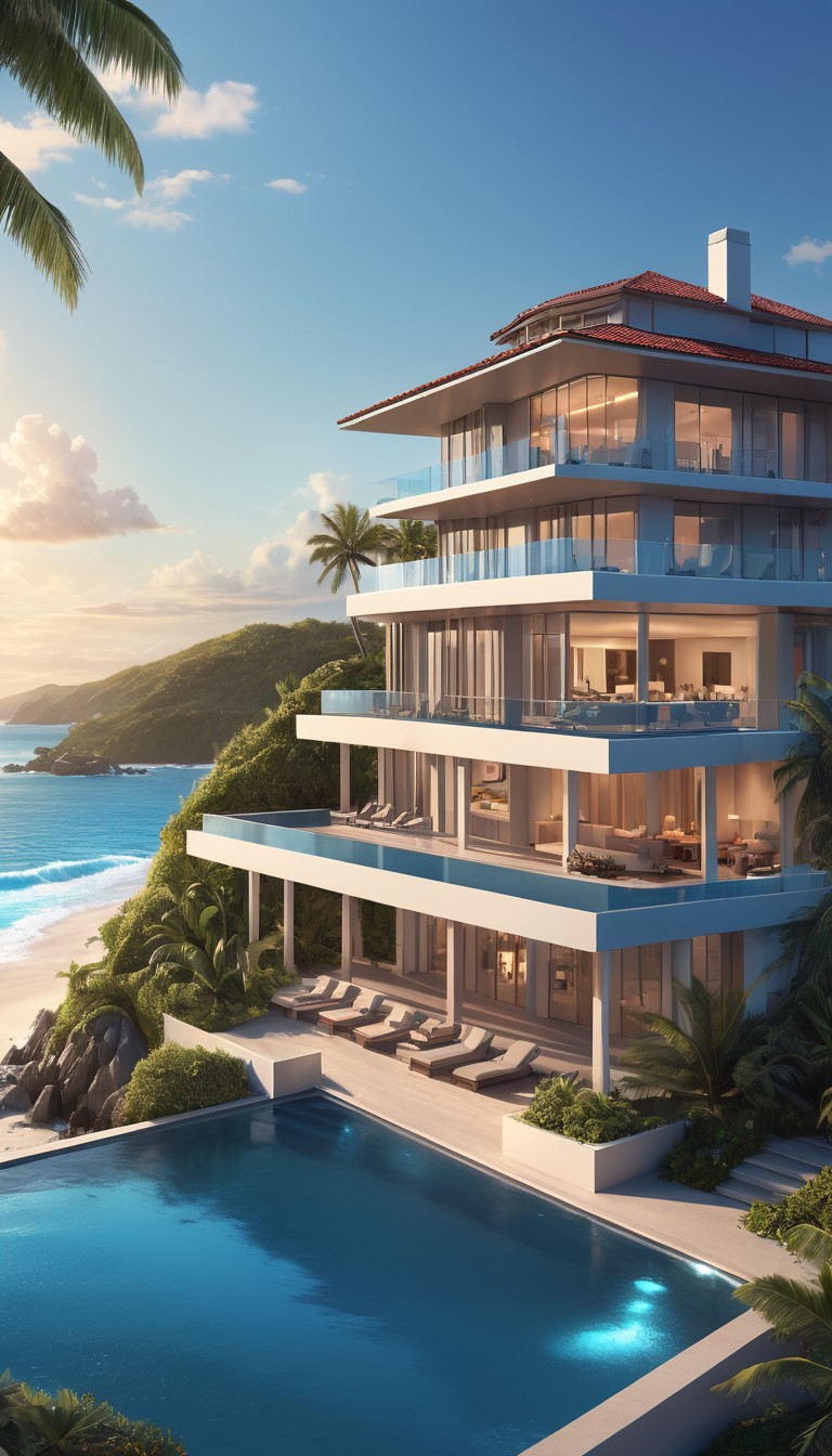 A modern, multi-story villa with a swimming pool overlooks a tropical beach at sunset.