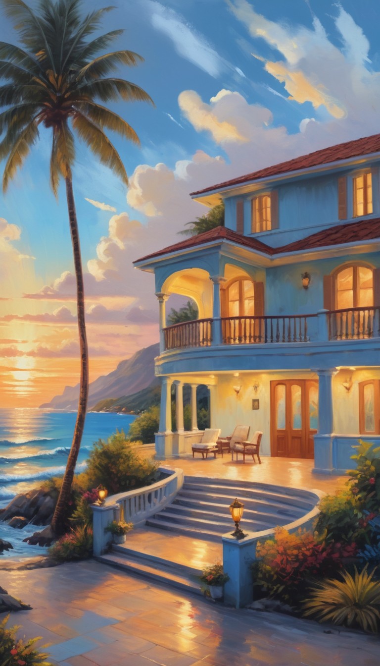A beach house with a palm tree in the foreground and a beautiful sunset in the background.