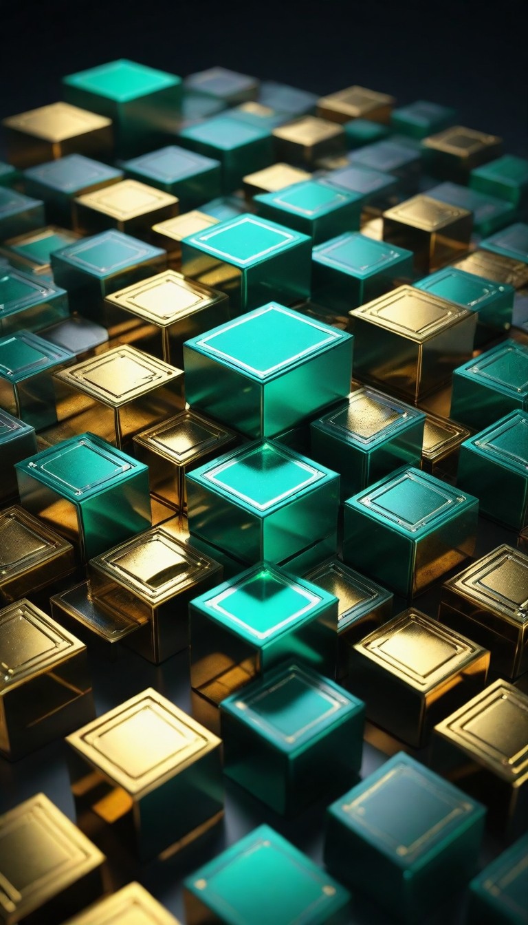 abstract, art, background, color, contemporary, cubes, design, geometric, glossy, gold, graphic, illustration, metallic, minimal, modern, pattern, render, shapes, teal, texture