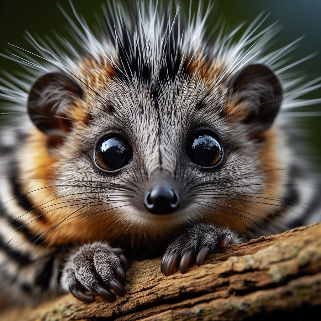 A small, furry olmouse with large eyes and spiky fur rests on a branch, looking directly at the camera.