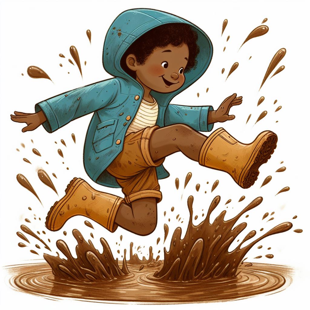 boots, brown, child, childhood, fun, happy, jumping, messy, mud, outdoors, play, puddle, rain, raincoat, smiling, splash, water, weather, wet, young
