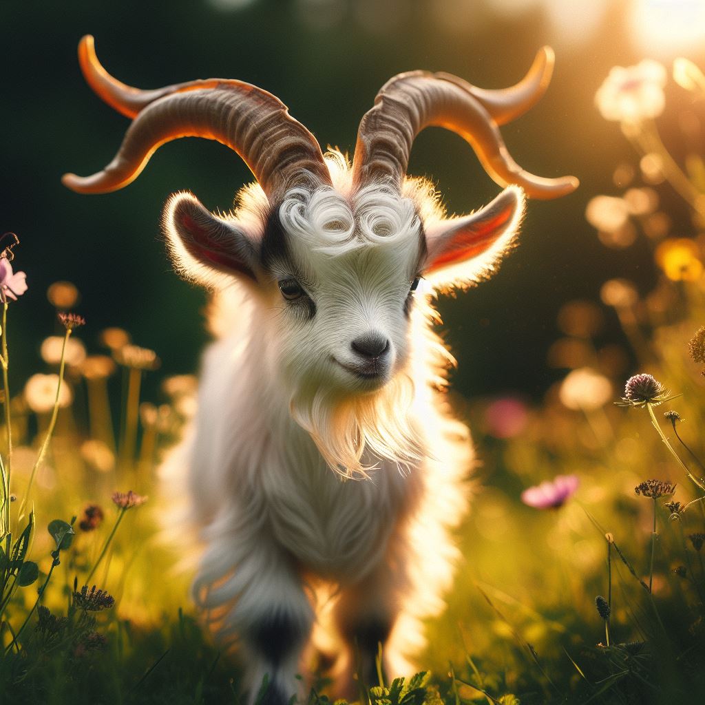 agriculture, animal, brown, closeup, farm, field, goat, grass, horns, light, mammal, nature, outdoor, spring, summer, sunset, white, wildflowers, wildlife, young