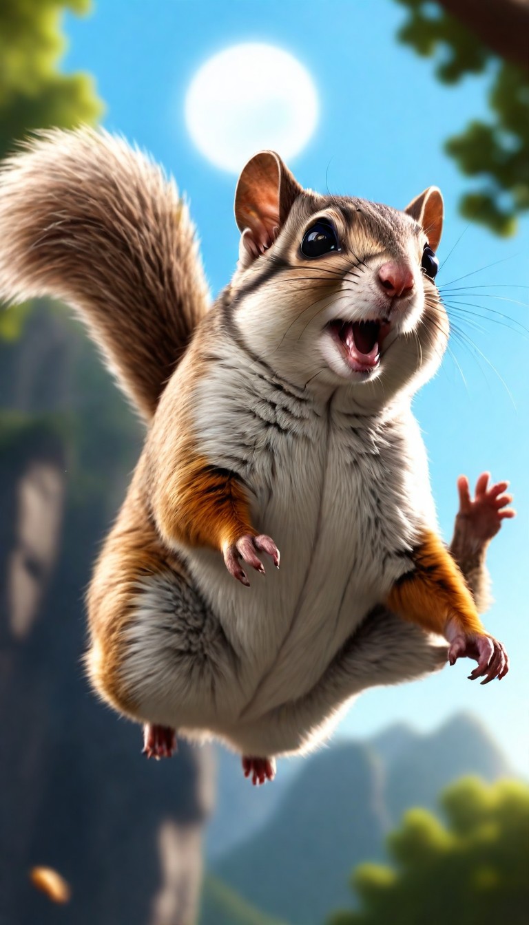 A squirrel soars through the air with a wide open mouth. Its furry tail streams behind it.