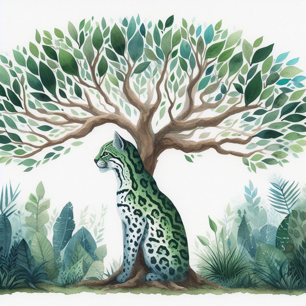 animal, art, artwork, cat, feline, foliage, green, illustration, jungle, leaves, mammal, nature, ocelot, rainforest, sitting, tree, under, watercolor, wildcat, wildlife