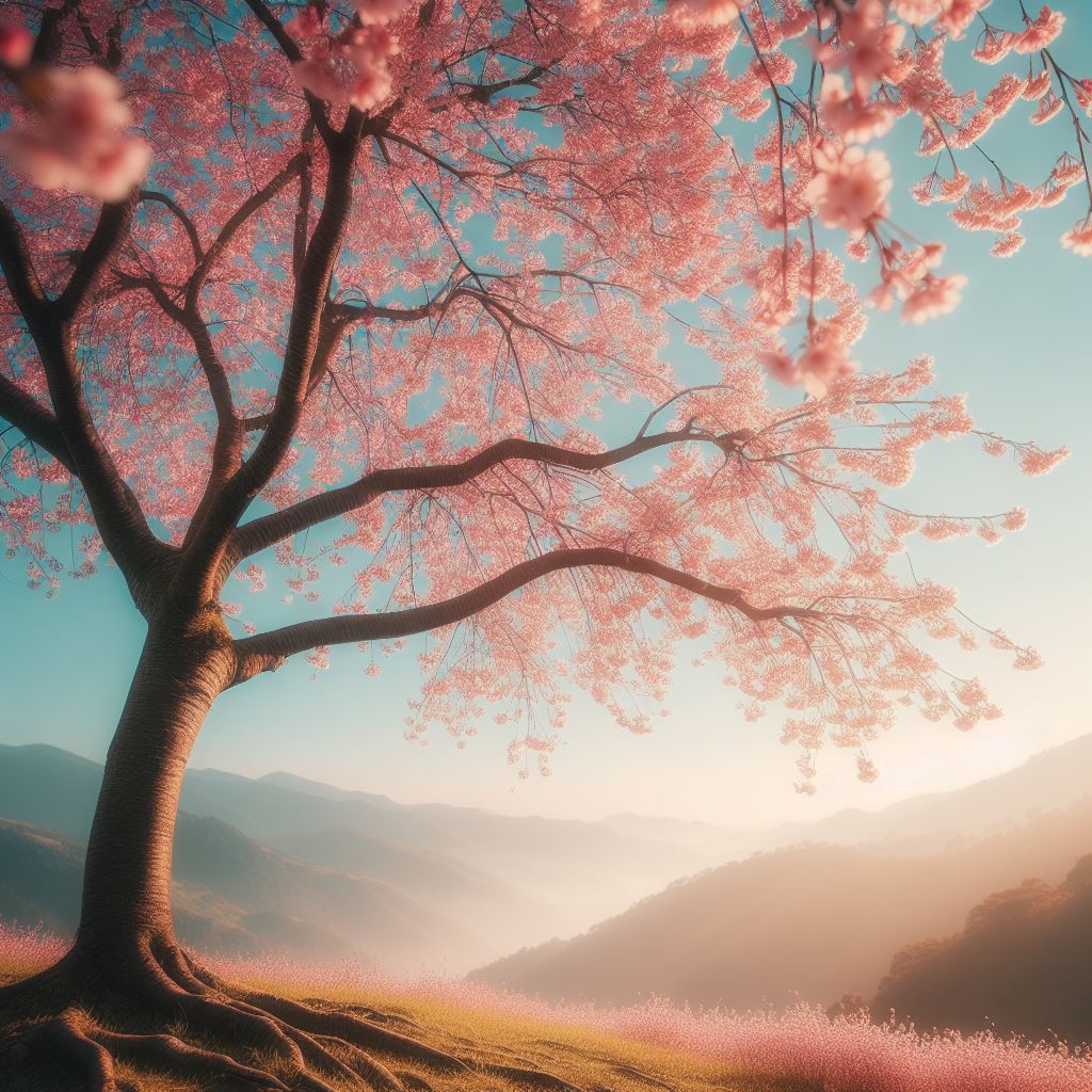 A single cherry blossom tree on a hillside, pink flowers blooming in the morning light with misty mountains in the backdrop