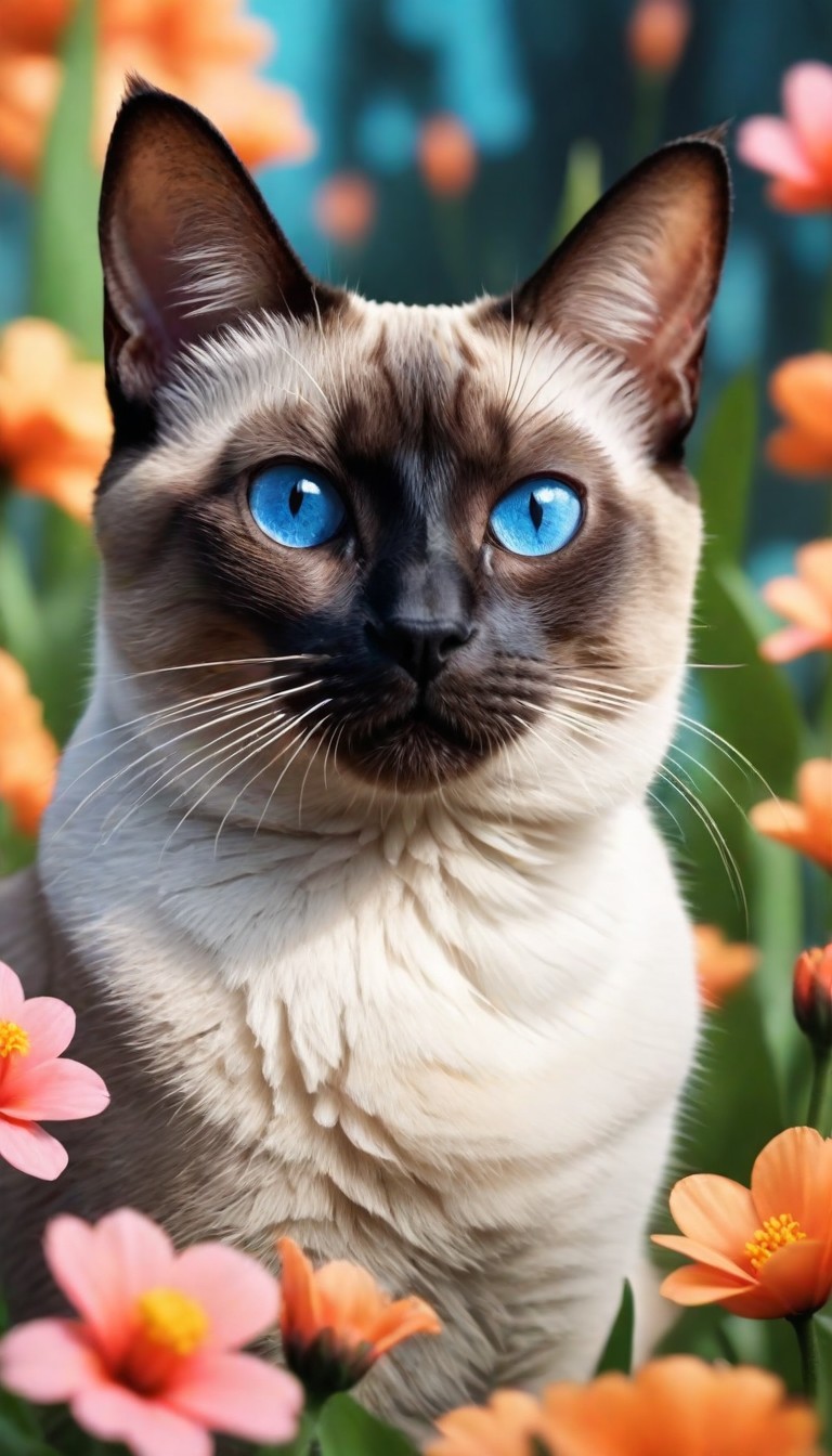 A Siamese cat with bright blue eyes sits among a field of pink and orange flowers.