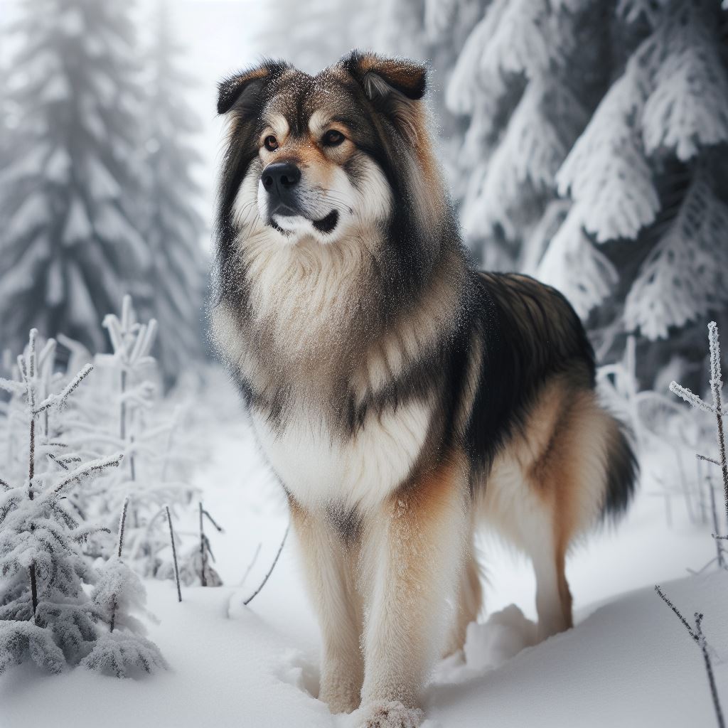 Large wolfdog in snowy forest with fluffy fur, looking to side. Snow-covered trees in background