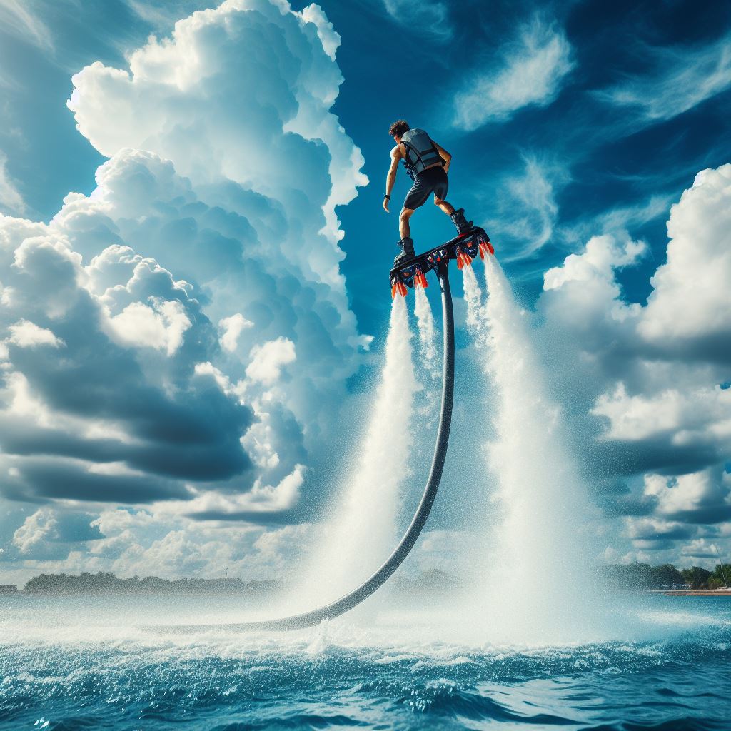 action, activity, adventure, air, cloud, day, flyboard, flyboarding, fun, jetpack, leisure, man, outdoor, recreation, sky, sport, sports, summer, sunny, water