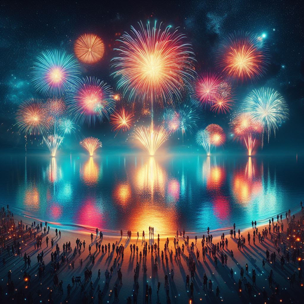 beach crowd, blue fireworks, celebration, colorful fireworks, crowd watching, digital art, gold fireworks, illustration, lake reflection, night scene, night sky, orange fireworks, pyrotechnics, red fireworks, sand beach, silhouetted people, stars, vibrant colors, water, fireworks