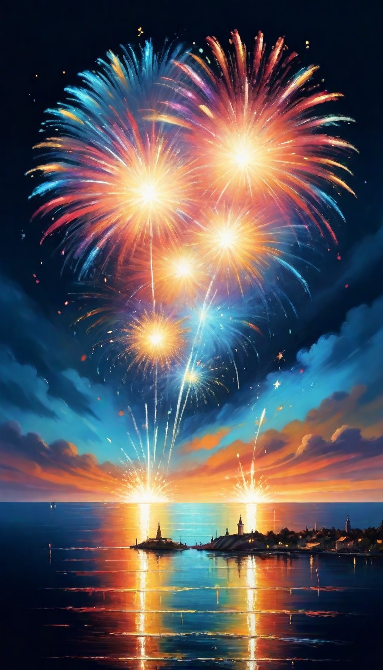 Colorful fireworks explode over a coastal city at sunset, their reflections shimmering on the calm water.
