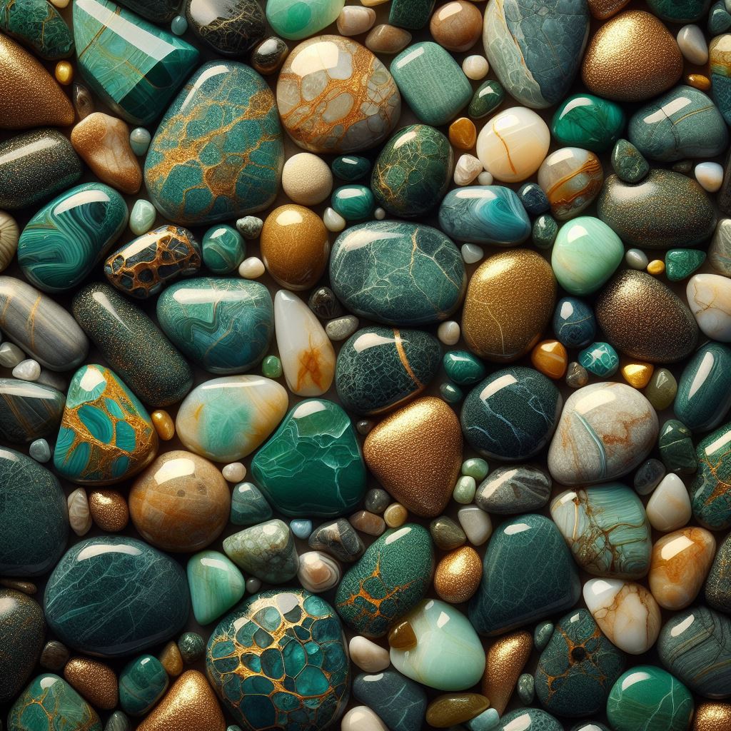 A close-up shot of various polished green and gold stones arranged on a surface.