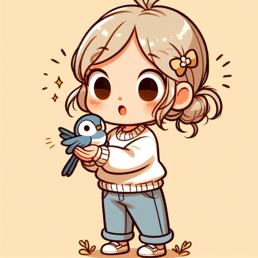 A cartoon girl with large eyes is holding a small blue bird in her hands. She is wearing a white sweater and blue jeans.
