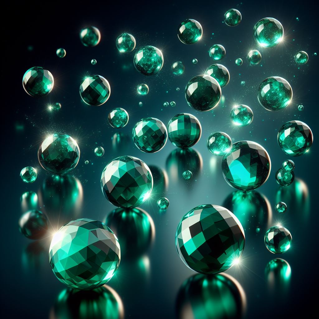 abstract, art, background, dark, design, emerald, floating, gem, gemstone, green, iridescent, jewel, jewelry, light, reflection, render, shimmer, shiny, sparkle, spheres