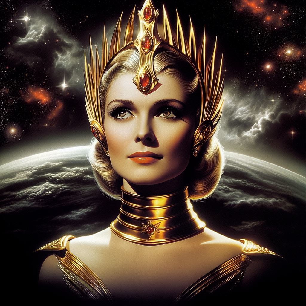 art, beauty, celestial, cosmic, crown, divine, ethereal, fantasy, goddess, golden, illustration, jewelry, mystical, planet, portrait, queen, royalty, space, stars, woman