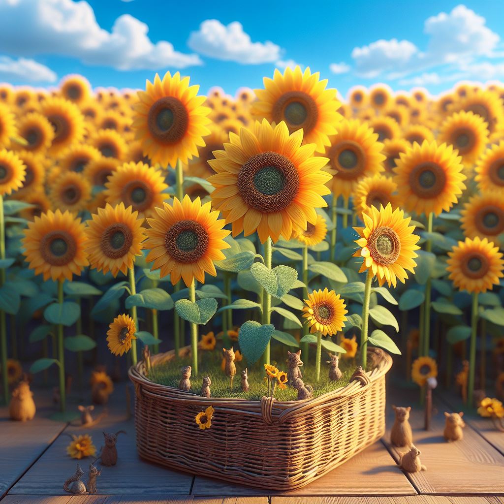 A wicker basket sits in a field of tall sunflowers with tiny figures gathered around it.