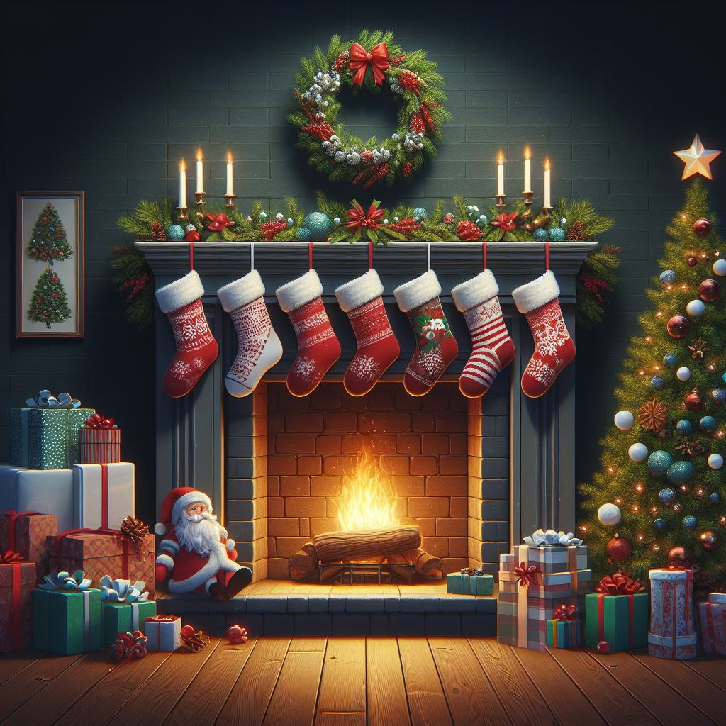 celebration, christmas, claus, cozy, december, decoration, festive, fire, fireplace, holiday, joy, mantle, night, presents, santa, stockings, tree, warmth, winter, wreath