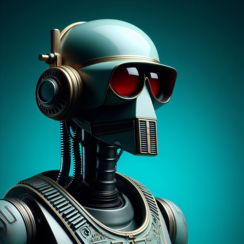 A futuristic robot with silver and gold details is wearing headphones and sunglasses against a blue backdrop.