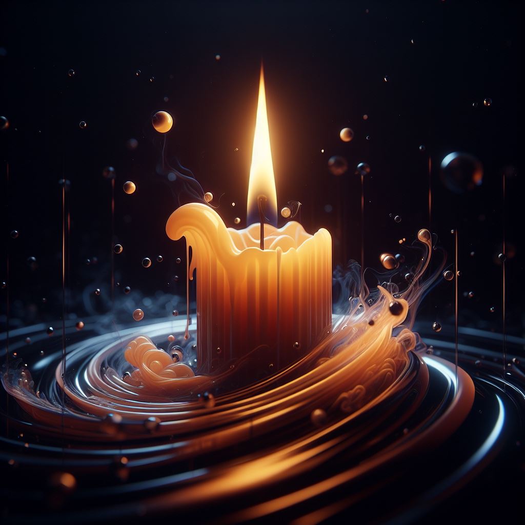 A lit candle sits in a swirling pool of liquid, casting a warm glow against the dark background.