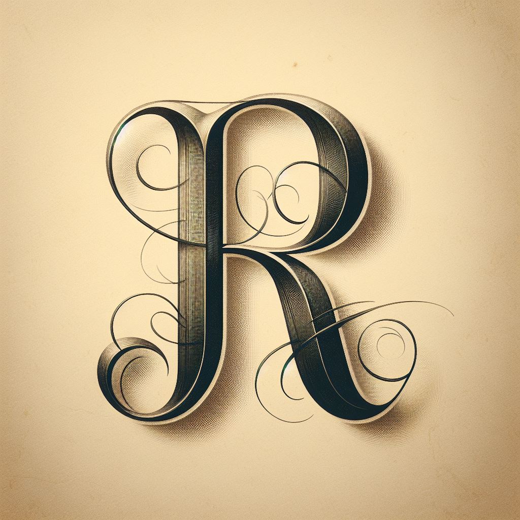 A calligraphic rendition of the letter R, featuring intricate swirls and shading.