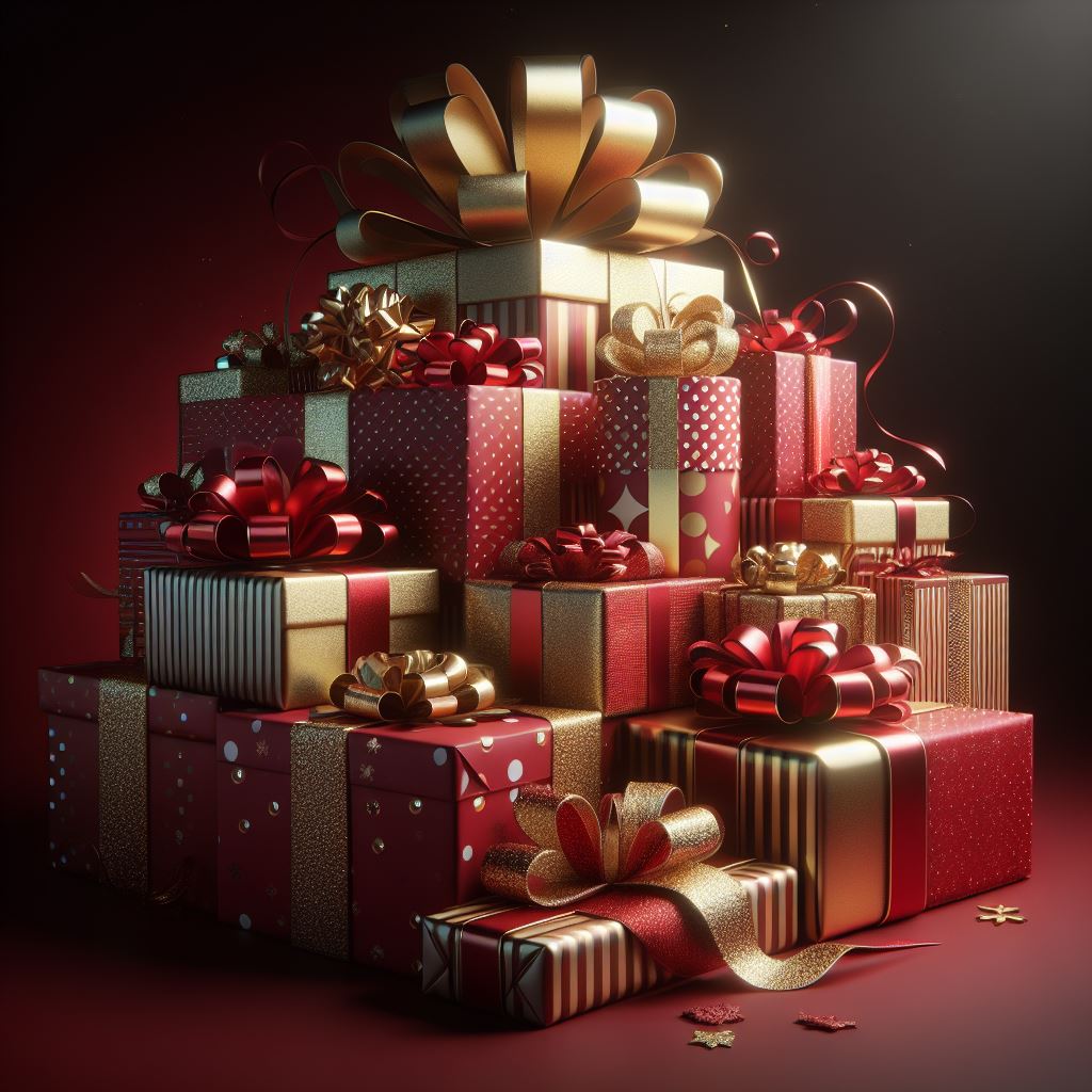 A pile of wrapped gifts with red and gold bows sits on a red surface.