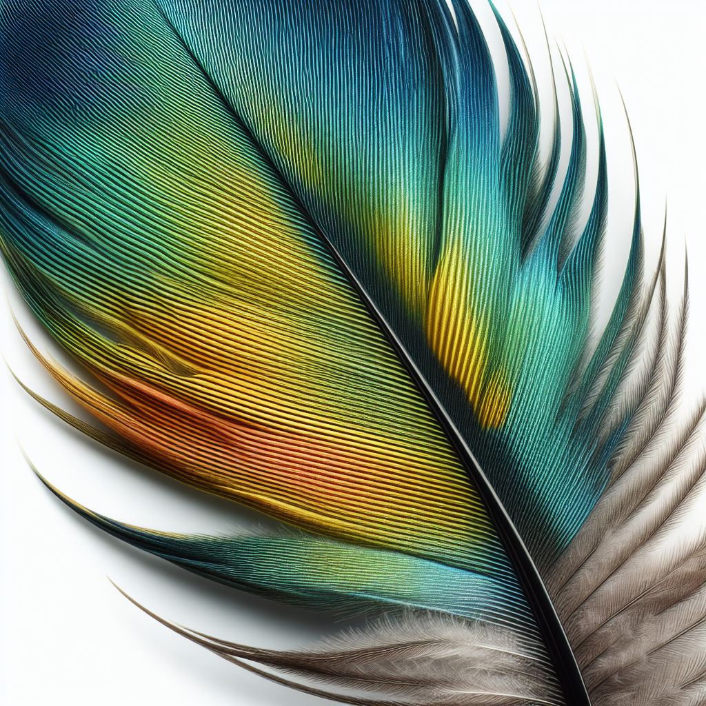 A close-up of a single bird feather, showing vibrant blue, green, yellow, and orange colors.