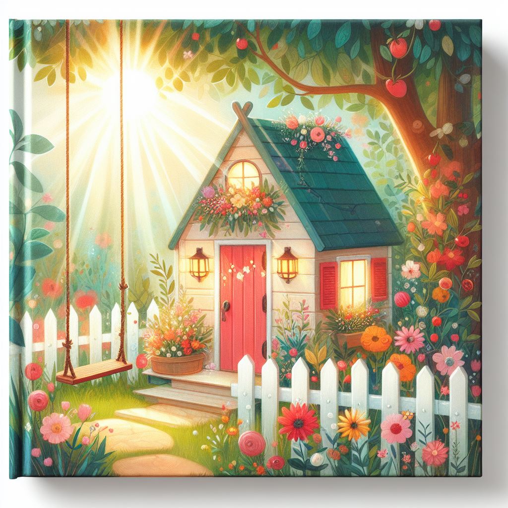 A charming cottage with a red door and a swing set in a lush garden filled with colorful flowers under a bright, sunny sky.