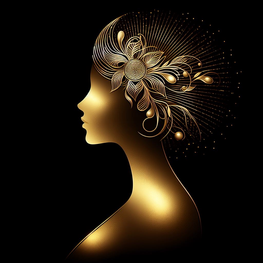 A golden silhouette of a woman's head and shoulders with an ornate floral design.