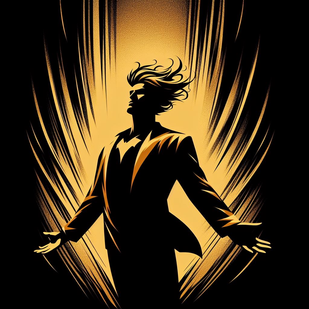 A silhouette of a man with windblown hair stands against a backdrop of swirling yellow lines, suggesting powerful energy.